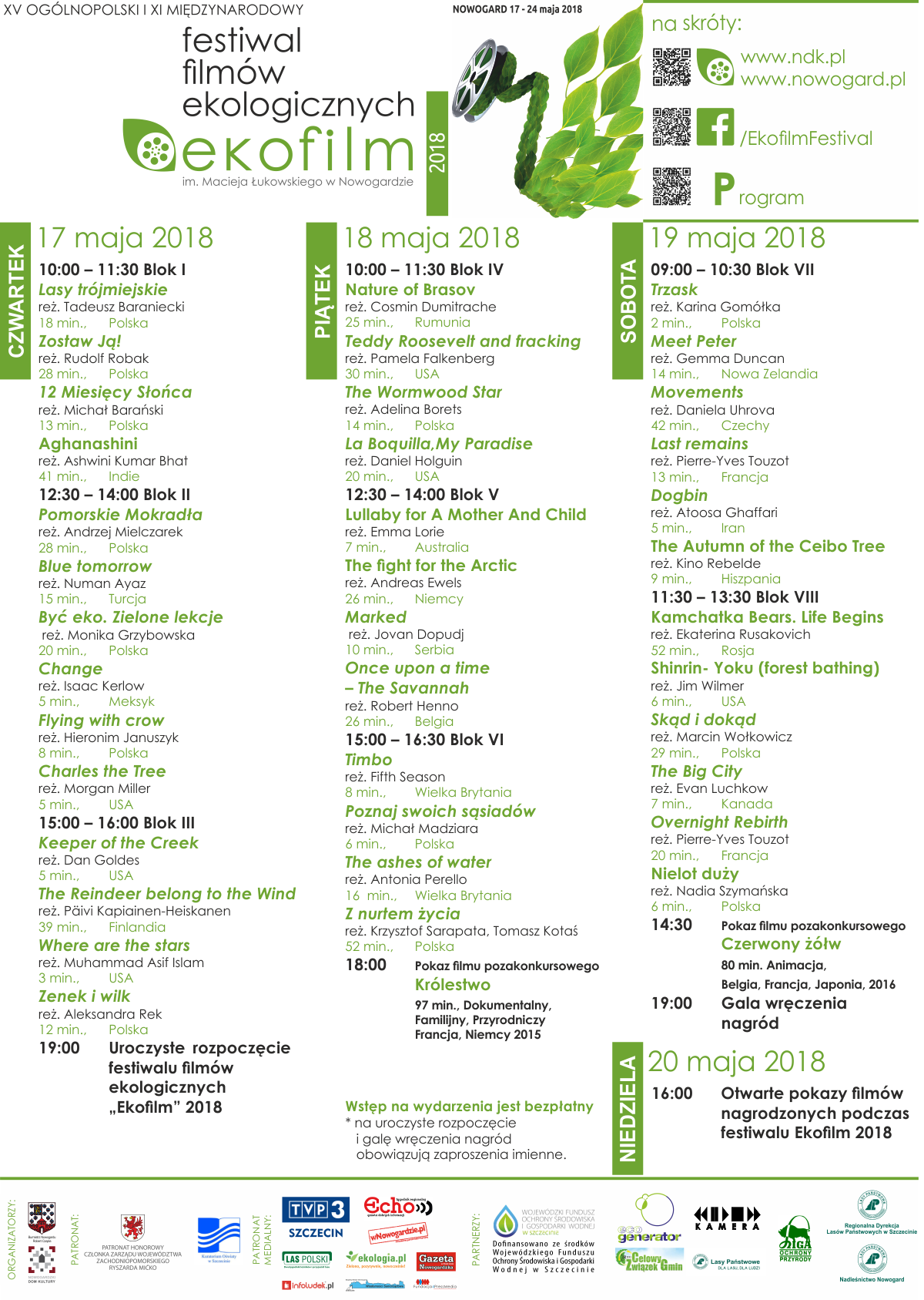 Lasy trójmiejskie reż. Tadeusz Baraniecki 18:01 Polska,Zostaw Ją! reż. Rudolf Robak 28:08 Polska,12 Miesięcy Słońca reż. Michał Barański 12:56 Polska,Aghanashini reż. Ashwini Kumar Bhat 41: 17 Indie,Pomorskie Mokradła reż. Andrzej Mielczarek 28:00 Polska,Blue tomorrow reż. Numan Ayaz 14:53 Turcja,Być eko. Zielone lekcje reż. Monika Grzybowska 20:28 Polska,Change reż. Isaac Kerlow 5:15 Meksyk,Flying with the Crow reż. Hieronim Januszyk 8:04 Polska,Charles the Tree reż. Morgan Miller 5:36 USA,Keeper of the Creek reż. Dan Goldes 5:37 USA,The Reindeer belong to the Wind reż. Päivi Kapiainen-Heiskanen 39:00 Finlandia,Where are the Stars? reż. Muhammad Asif Islam 3:29 USA,Zenek i wilk reż. Aleksandra Rek 12:00 Polska,Nature of Brasov reż. Cosmin Dumitrache 25:16 Rumunia,Teddy Roosevelt and fracking reż. Pamela Falkenberg 29:59 USA,The Wormwood Star reż. Adelina Borets 14:22 Polska,La Boquilla, My Paradise reż. Daniel Holguin 20:00 USA,Lullaby for A Mother And Child reż. Emma Lorie 7:29 Australia,The fight for the Arctic reż. Andreas Ewels 26:20 Niemcy,Marked reż. Jovan Dopudj 10:47 Serbia,Once upon a time – The savannah reż. Robert Henno 26:26 Belgia,Timbo reż. Fifth Season 8:53 Wielka Brytania,Poznaj swoich sąsiadów reż. Michał Madziara 5:51 Polska,The ashes of water reż. Antonia Perello 16:38 Wielka Brytania,Z nurtem życia reż. Krzysztof Sarapata, Tomasz Kotaś 52:04 Polska,Trzask reż. Karina Gomółka 2:02 Polska,Meet Peter reż. Gemma Duncan 14:14 Nowa Zelandia,Movements reż. Daniela Uhrova 42:00 Czechy,Last remains reż. Pierre-Yves Touzot 13:21 Francja,Dogbin reż. Atoosa Ghaffari 5:30 Iran,The Autumn of the Ceibo Tree reż. Kino Rebelde 9:14 Hiszpania,Kamchatka Bears. Life Begins reż. Ekaterina Rusakovich 52:35 Rosja,Shinrin- Yoku (forest bathing) reż. Jim Wilmer 6:05 USA,Skąd i dokąd reż. Marcin Wołkowicz 28:59 Polska,The Big City reż. Evan Luchkow 7:00 Kanada,Overnight Rebirth reż. Pierre-Yves Touzot 20:04 Francja,Nielot duży reż. Nadia Szymańska 6:26 Polska.